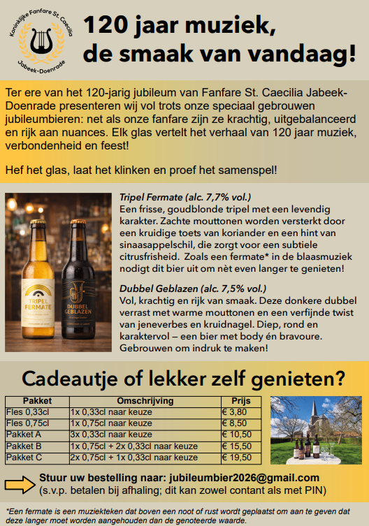 Ter ere van het 120-jarig jubileum van Fanfare St. Caecilia JabeekDoenrade presenteren wij vol trots onze speciaal gebrouwen jubileumbieren: net als onze fanfare zijn ze krachtig, uitgebalanceerd en rijk aan nuances. Elk glas vertelt het verhaal van 120 jaar muziek, verbondenheid en feest! Hef het glas, laat het klinken en proef het samenspel!